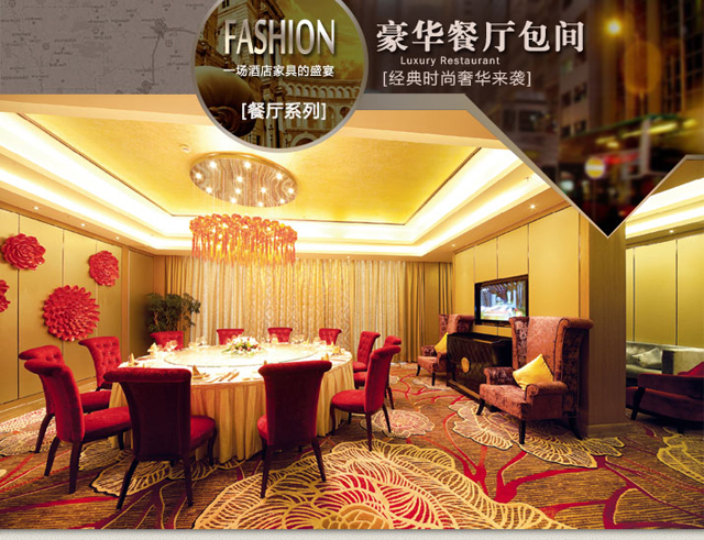 產品簡介:酒店家具豪華餐廳包間,餐廳包間桌椅組合,專業定制各種豪華酒店家具,精裝(zhuang)豪宅家具等并提供(gong)裝(zhuang)飾設計。