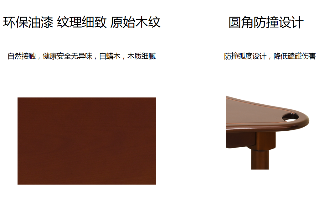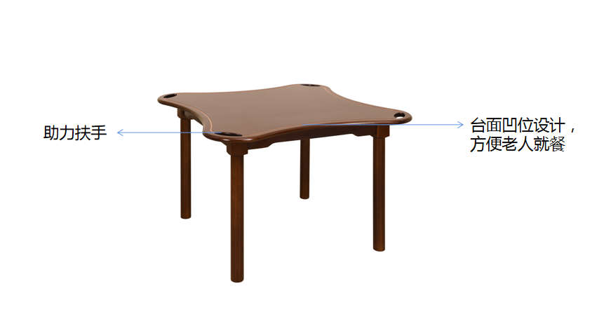 餐桌(zhuo) 基材:為實(shi)木白蠟木框架(jia)結(jie)構 臺(tai)面凹位設計(ji),便于(yu)輪椅(yi)長(chang)者就餐 四角(jiao)設有助力拉手孔,便于(yu)借力 桌(zhuo)角(jiao)大(da)圓角(jiao)設計(ji),減低碰撞傷(shang)害,拆裝結(jie)構,便于(yu)運輸。