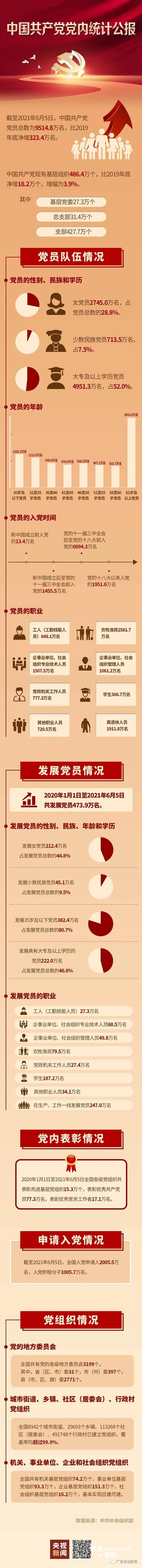 新(xin)華社(she)北京6月(yue)30日電中央組(zu)織部最新(xin)黨(dang)(dang)(dang)內統計數(shu)據顯示(shi),截至2021年6月(yue)5日,中國共(gong)產黨(dang)(dang)(dang)黨(dang)(dang)(dang)員總(zong)數(shu)為9514.8萬(wan)名,黨(dang)(dang)(dang)的基層組(zu)織總(zong)數(shu)為486.4萬(wan)個。歷經百(bai)年風雨,中國共(gong)產黨(dang)(dang)(dang)從小到大、由弱(ruo)到強,從建黨(dang)(dang)(dang)時(shi)50多名黨(dang)(dang)(dang)員,發展(zhan)成(cheng)為今(jin)天已(yi)經擁(yong)有9500多萬(wan)名黨(dang)(dang)(dang)員、在14億多人口的大國長期執政(zheng)的黨(dang)(dang)(dang)。