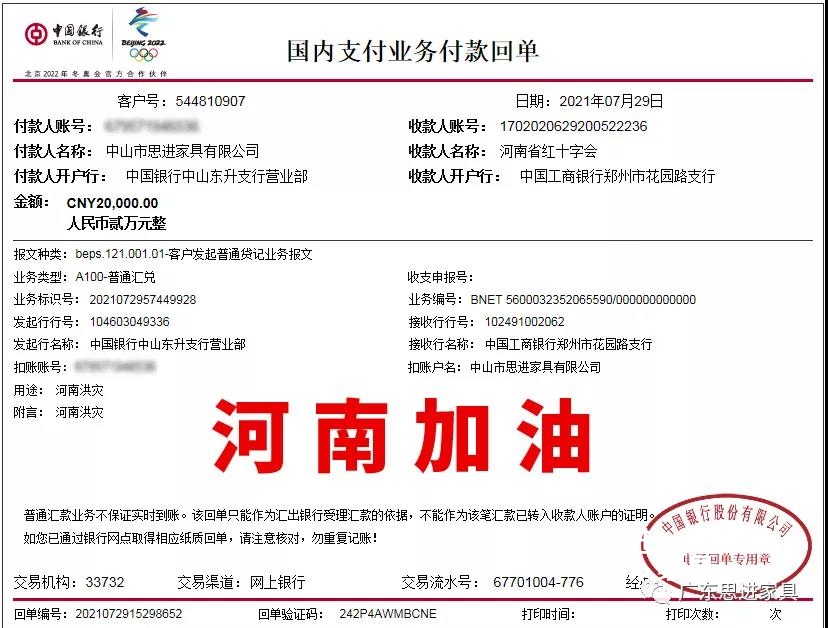 思進家具盡綿薄之力,向河南省紅十字會捐贈2萬元整,用于河南緊急采購抗洪救災物資和災后重建工作。