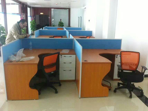 公司職員區采用思進家具板式辦公桌SUV02-PF3624訂做藍色屏風和櫻桃色膠板
