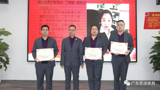 ?思進品牌總經理戴金榮為三位“銷售虎將”—馬春水(左一)、丁銀銀·(右二)、褚千里(出差中,同事代領)頒發證書
