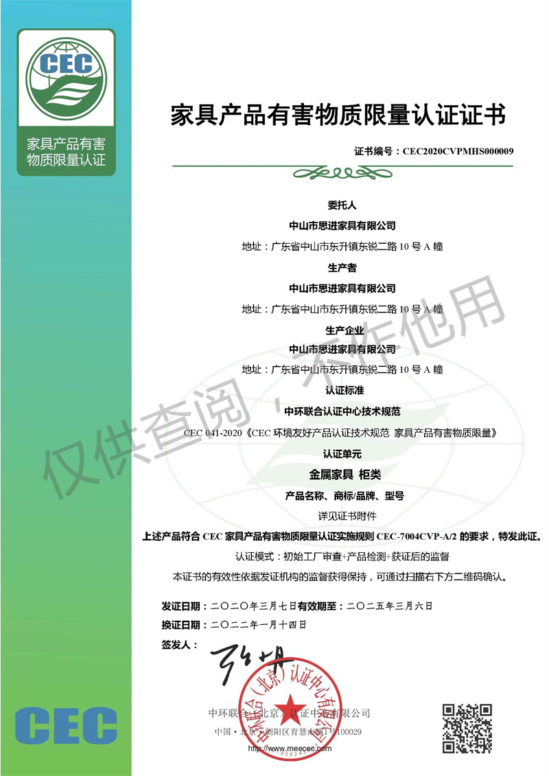 家具有害物質限量認證證書-金屬柜類